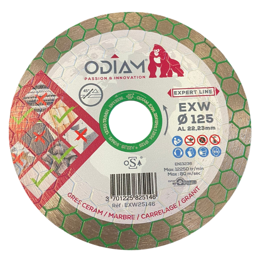 Elaboré pour coupe à sec à 45° en toute sécurité. Sa jante continue extra fine de haute performance en H25mm offre une coupe extrêmement précise, rapide et avec une belle finition. Excellente longévité. L’EXW est le 1er disque coupe 45° certifié oSa.
